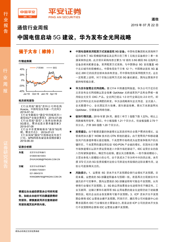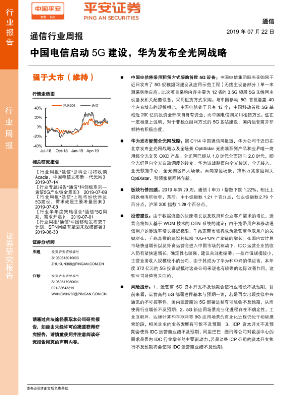 【平安证券】【20190722】通信行业周报:中国电信启动5G建设,华为发布全光网战略-5页