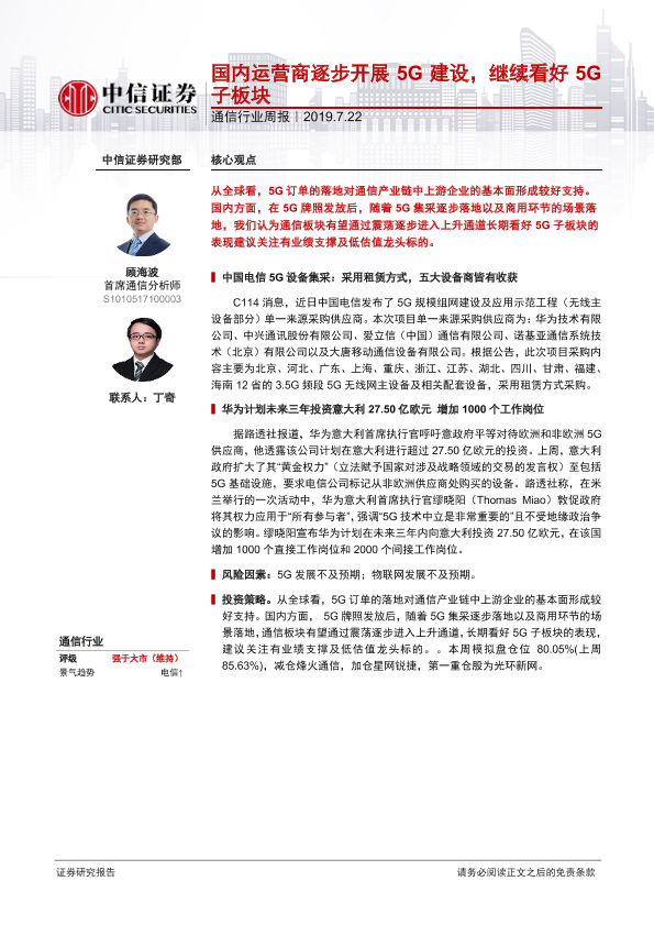 【中信证券】【20190722】20190722-中信证券-通信行业周报:国内运营商逐步开展5G建设,继续看好5G子板块-7页