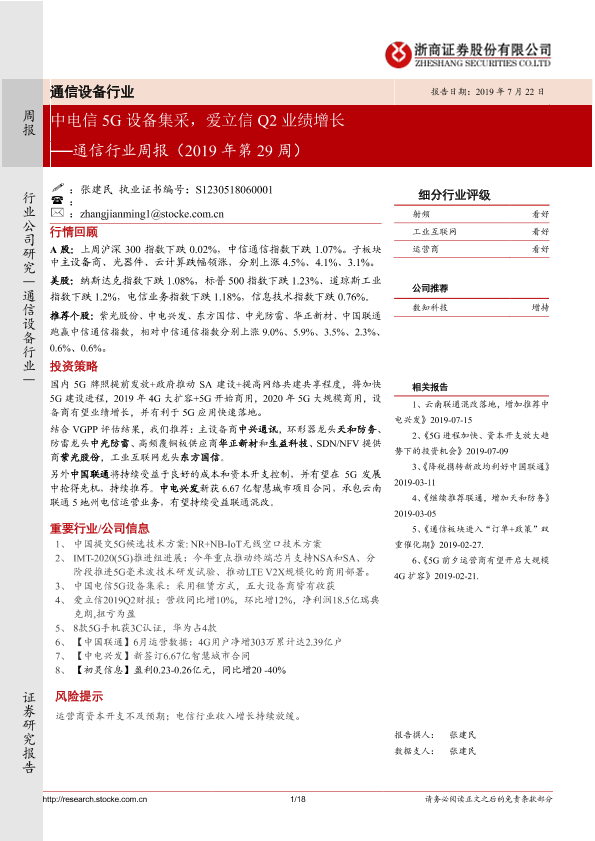 【浙商证券】【20190722】2019年第29周通信行业周报:中电信5G设备集采,爱立信Q2业绩增长-18页