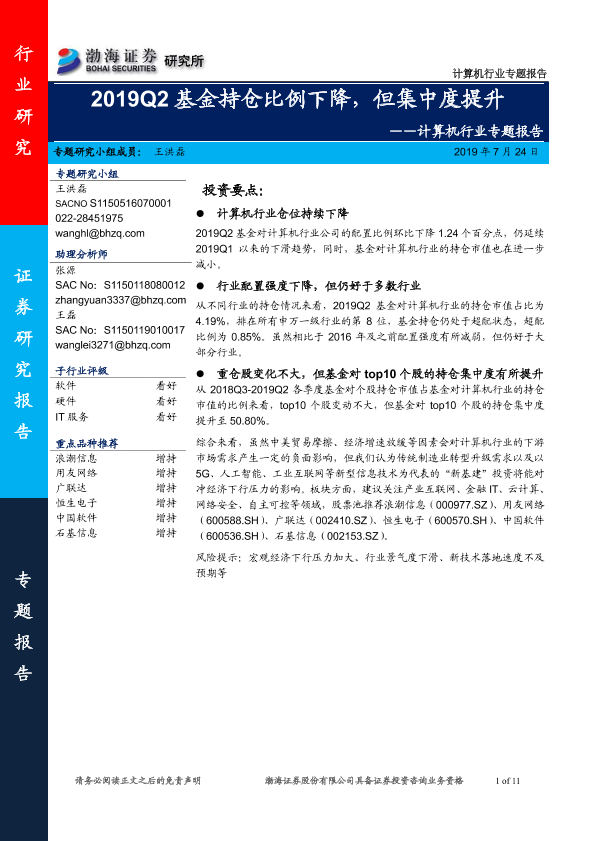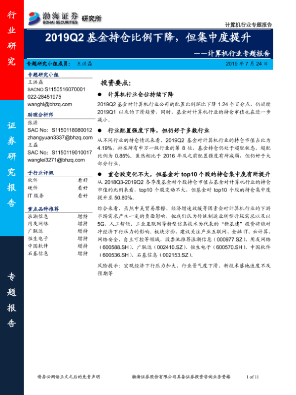 信息技术 基金持仓 市场分析 投资建议 计算机行业