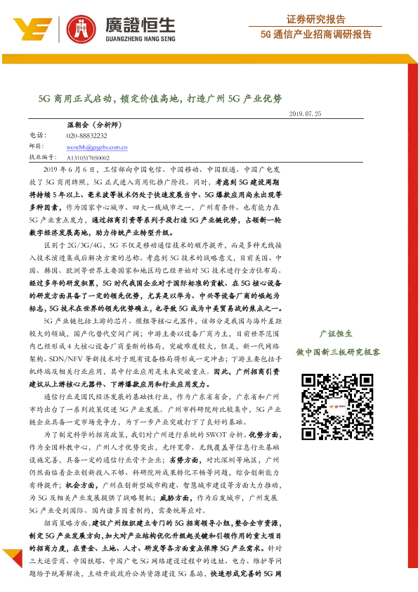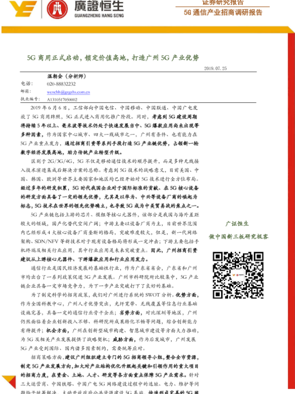 【广证恒生】【20190725】5G通信产业招商调研报告:5G商用正式启动,锁定价值高地,打造广州5G产业优势-77页