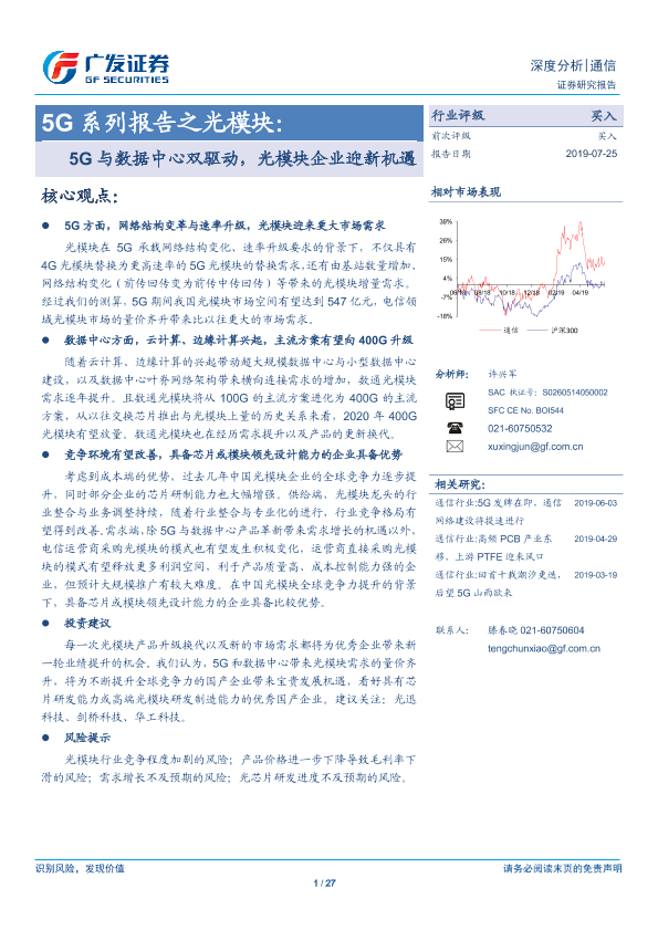 【广发证券】【20190725】5G系列报告之光模块:5G与数据中心双驱动,光模块企业迎新机遇-27页
