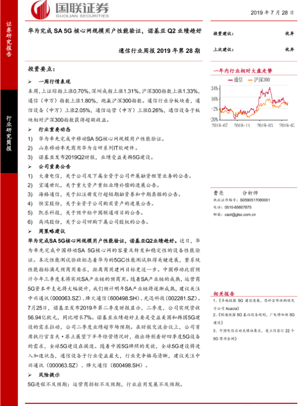 【国联证券】【20190728】通信行业周报2019年第28期:华为完成SA 5G核心网规模用户性能验证,诺基亚Q2业绩趋好-10页