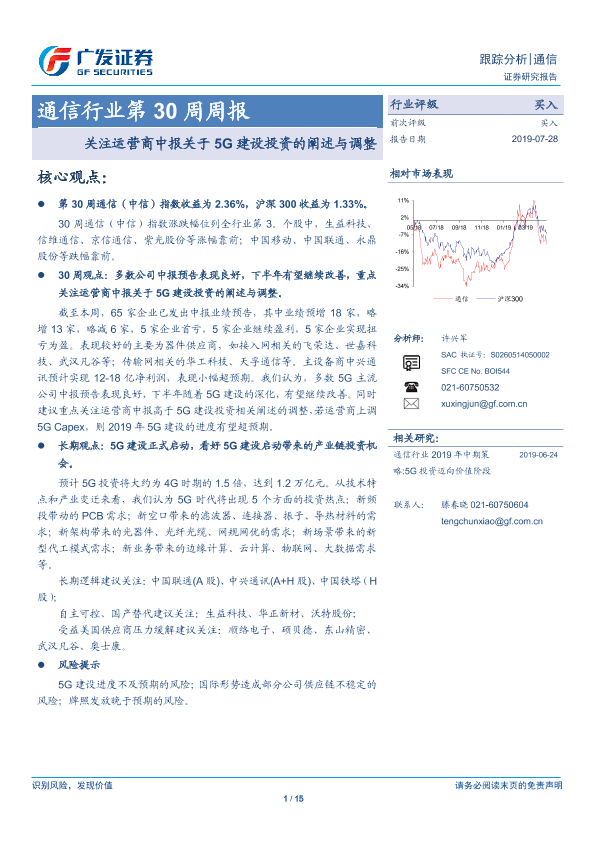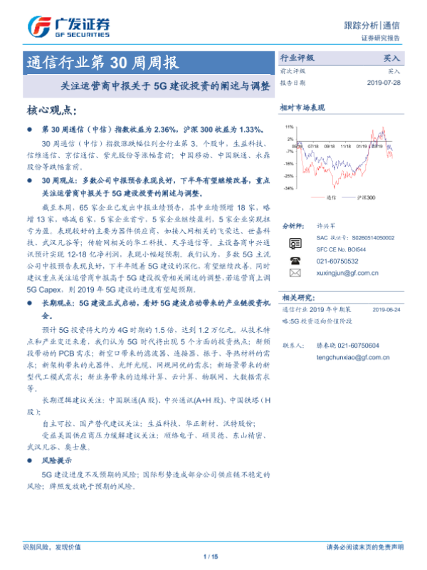 【广发证券】【20190728】20190728-广发证券-通信行业第30周周报:关注运营商中报关于5G建设投资的阐述与调整-15页