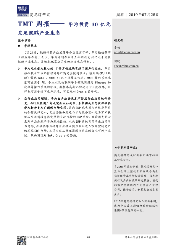 【莫尼塔研究】【20190728】TMT周报:华为投资30亿元发展鲲鹏产业生态-6页