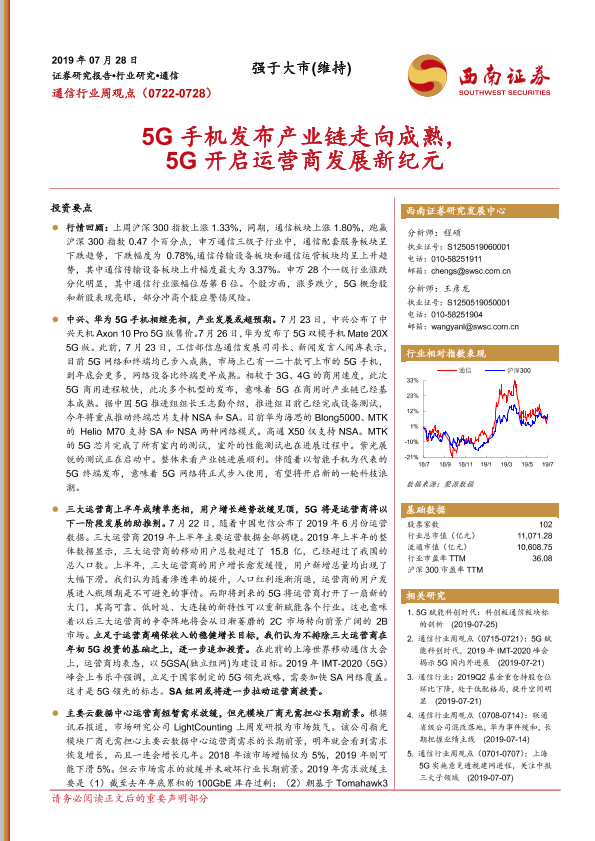 【西南证券】【20190728】通信行业周观点:5G手机发布产业链走向成熟,5G开启运营商发展新纪元-27页