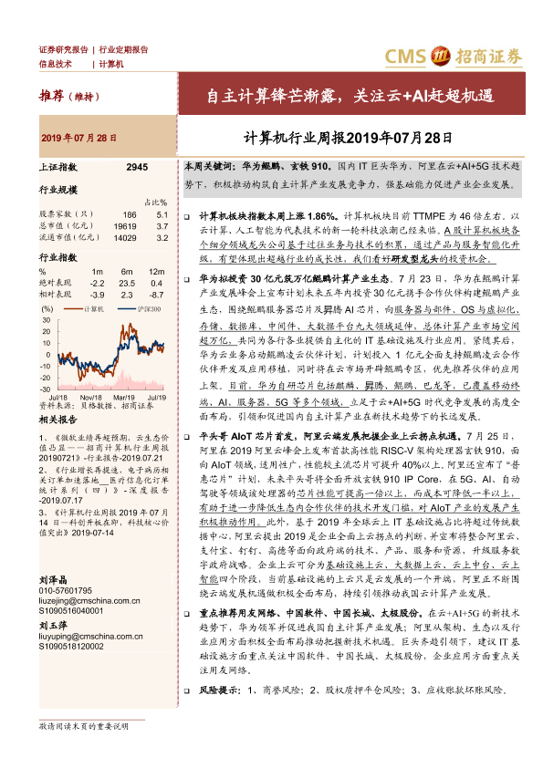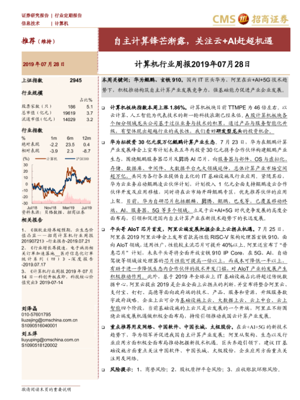 【海通证券】【20190728】20190728-招商证券-计算机行业周报:自主计算锋芒渐露,关注云+AI赶超机遇-19页