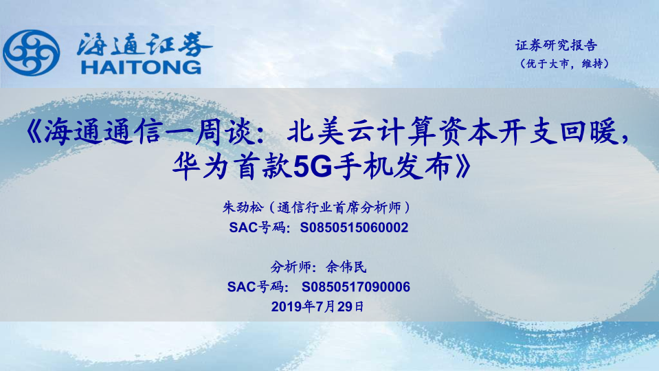 【海通证券】【20190729】海通通信一周谈:北美云计算资本开支回暖,华为首款5G手机发布-9页
