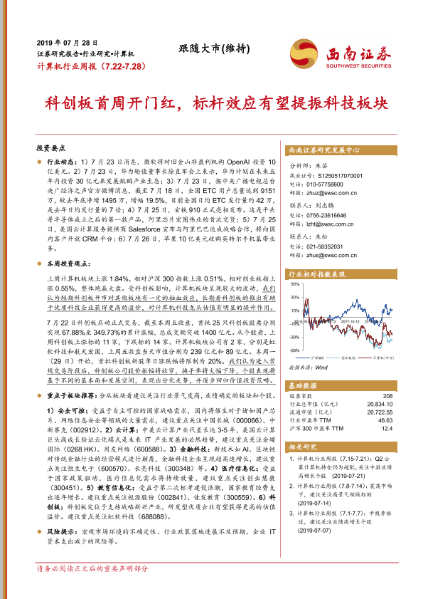 【西南证券】【20190728】20190728-西南证券-计算机行业周报:科创板首周开门红,标杆效应有望提振科技板块-19页
