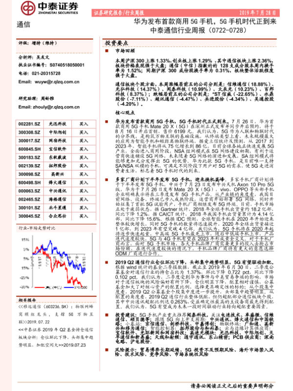 【中泰证券】【20190728】中泰通信行业周报:华为发布首款商用5G手机,5G手机时代正到来-11页
