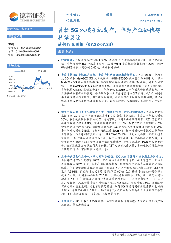 【德邦证券】【20190729】20190729-德邦证券-通信行业周报:首款5G双模手机发布,华为产业链值得持续关注-4页