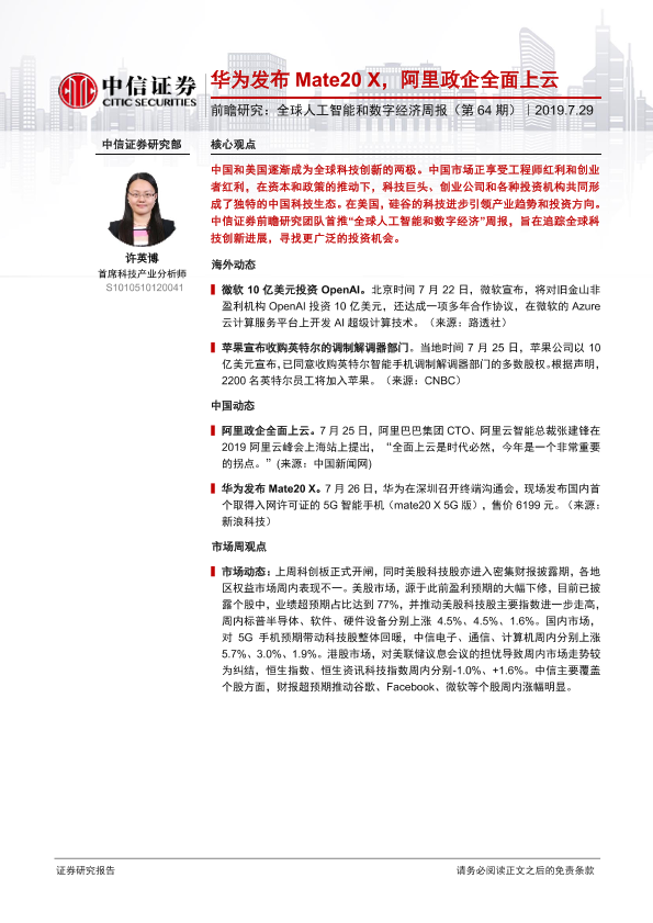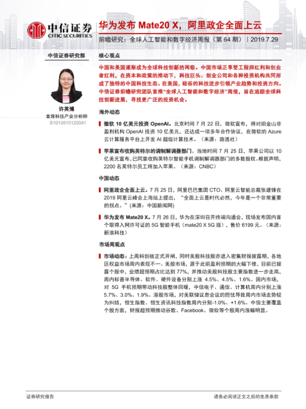 【中信证券】【20190729】全球人工智能和数字经济周报(第64期):华为发布Mate20 X,阿里政企全面上云-11页
