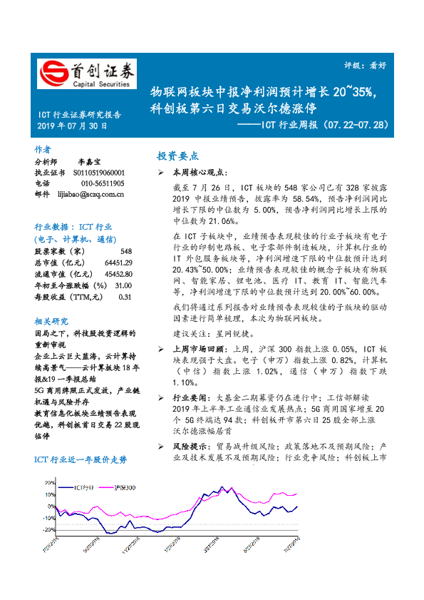 【首创证券】【20190730】ICT行业周报:物联网板块中报净利润预计增长20~35%,科创板第六日交易沃尔德涨停-15页