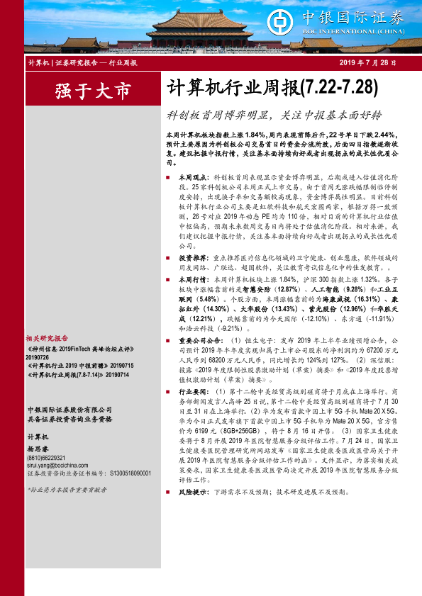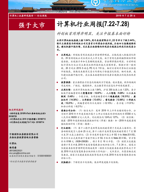 【中银证券】【20190728】计算机行业周报:科创板首周博弈明显,关注中报基本面好转-11页