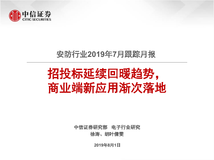 【中信证券】【20190801】安防行业2019年7月跟踪月报:招投标延续回暖趋势,商业端新应用渐次落地-19页