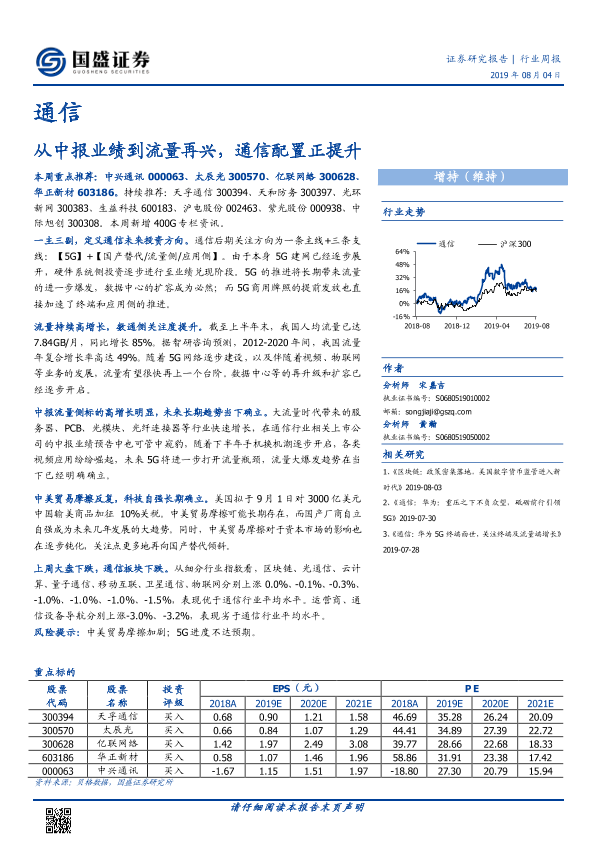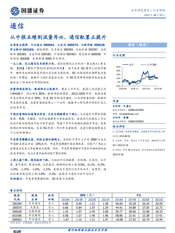 【国盛证券】【20190804】通信行业周报:从中报业绩到流量再兴,通信配置正提升-9页