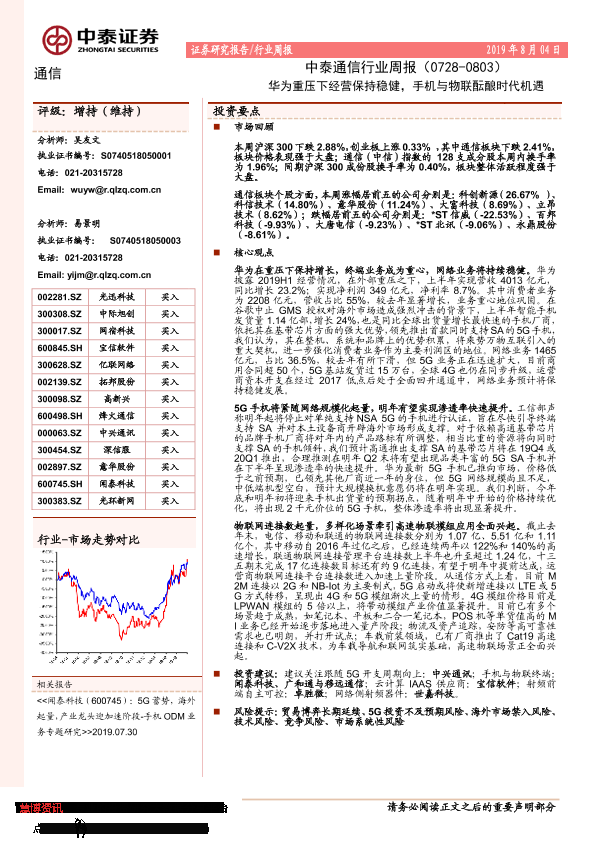 【中泰证券】【20190804】中泰通信行业周报:华为重压下经营保持稳健,手机与物联酝酿时代机遇-10页