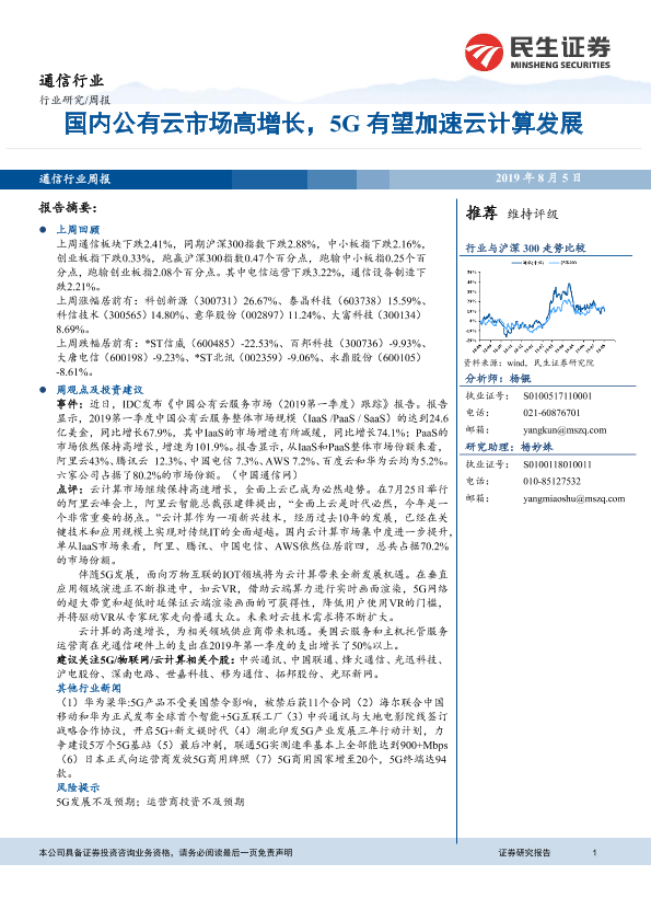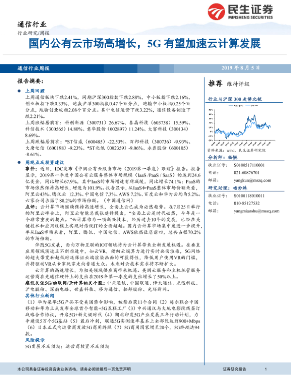 【民生证券】【20190805】通信行业周报:国内公有云市场高增长,5G有望加速云计算发展-10页