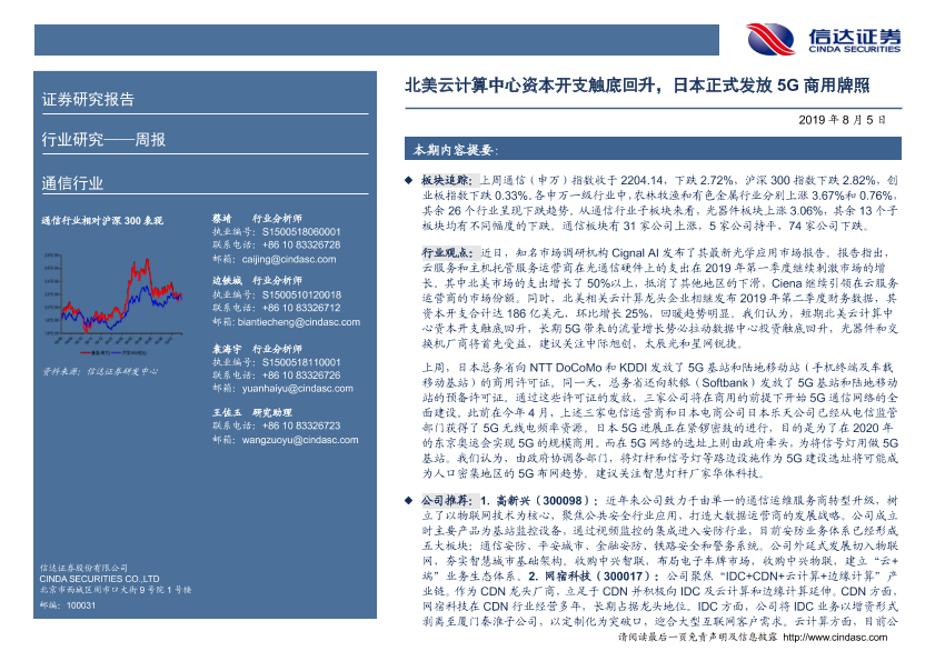 【信达证券】【20190805】通信行业周报:北美云计算中心资本开支触底回升,日本正式发放5G商用牌照-14页