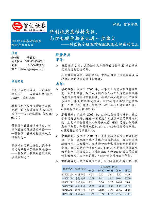 【首创证券】【20190805】20190805-首创证券-科创板个股及对标股表现点评系列之三:科创板热度保持高位,与对标股价格差距进一步拉大-4页