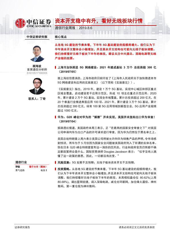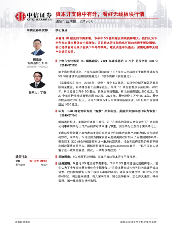 【中信证券】【20190806】20190806-中信证券-通信行业周报:资本开支稳中有升,看好无线板块行情-8页