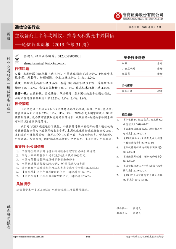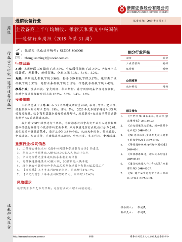 【浙商证券】【20190805】通信行业周报(2019年第31周):主设备商上半年均增收,推荐天和紫光中兴国信-18页
