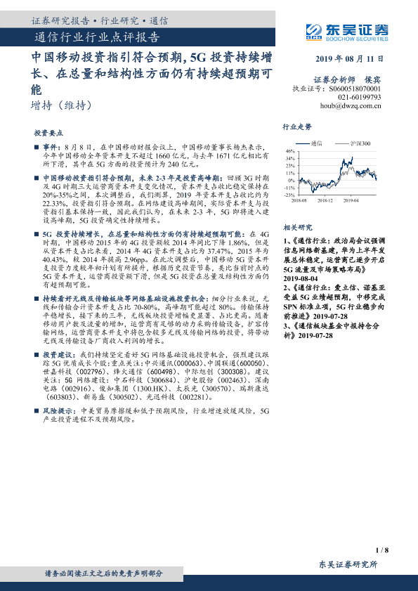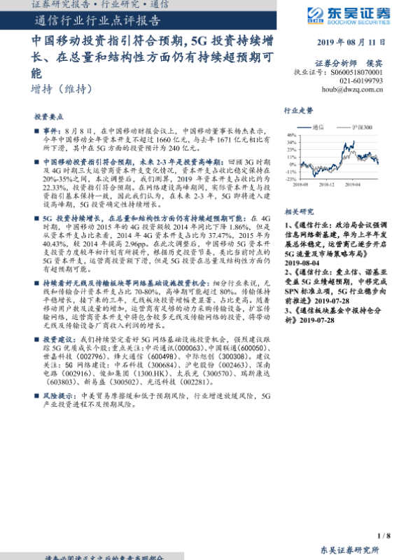 【东吴证券】【20190811】通信行业行业点评报告:中国移动投资指引符合预期,5G投资持续增长、在总量和结构性方面仍有持续超预期可能-8页