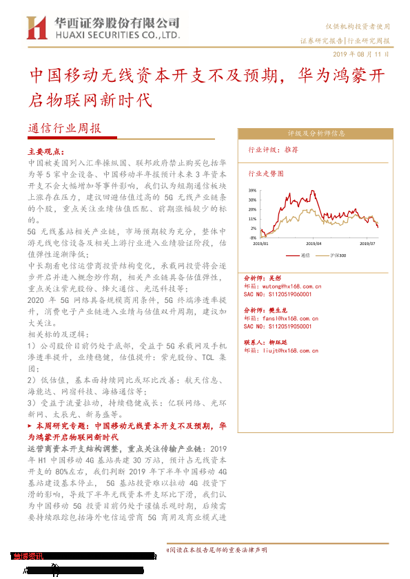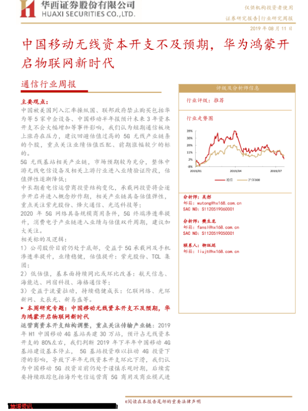 【华西证券】【20190811】20190811-华西证券-通信行业周报:中国移动无线资本开支不及预期,华为鸿蒙开启物联网新时代-17页