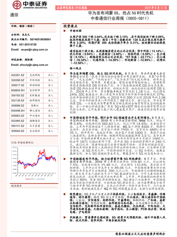 【中泰证券】【20190811】中泰通信行业周报:华为发布鸿蒙OS,抢占5G时代先机-8页