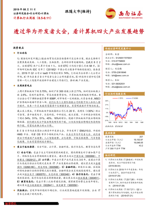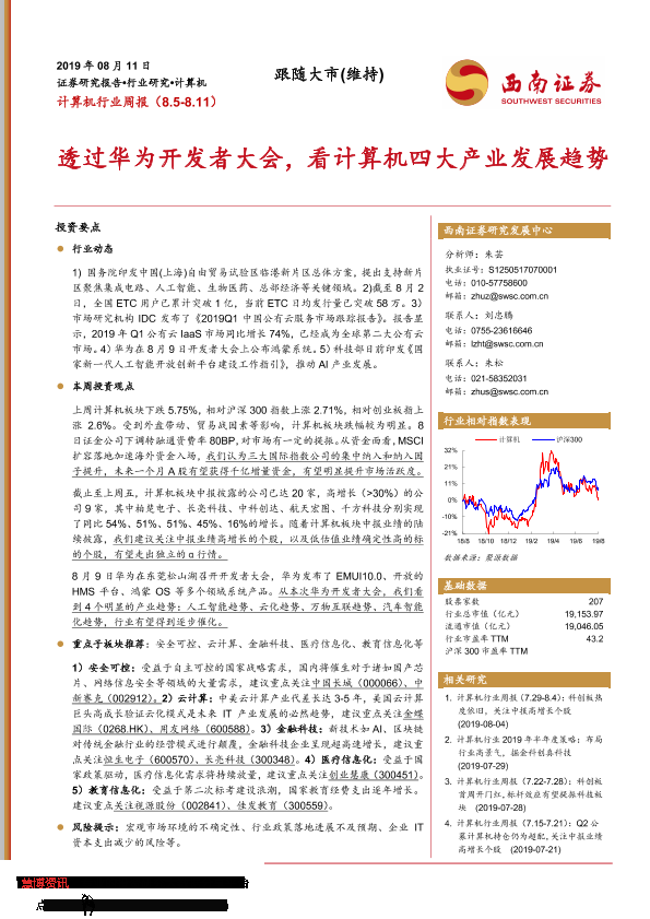 【西南证券】【20190811】20190811-西南证券-计算机行业周报:透过华为开发者大会,看计算机四大产业发展趋势-14页