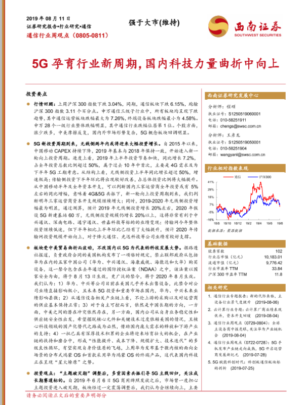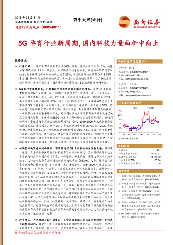 【西南证券】【20190811】通信行业周观点:5G孕育行业新周期,国内科技力量曲折中向上-27页