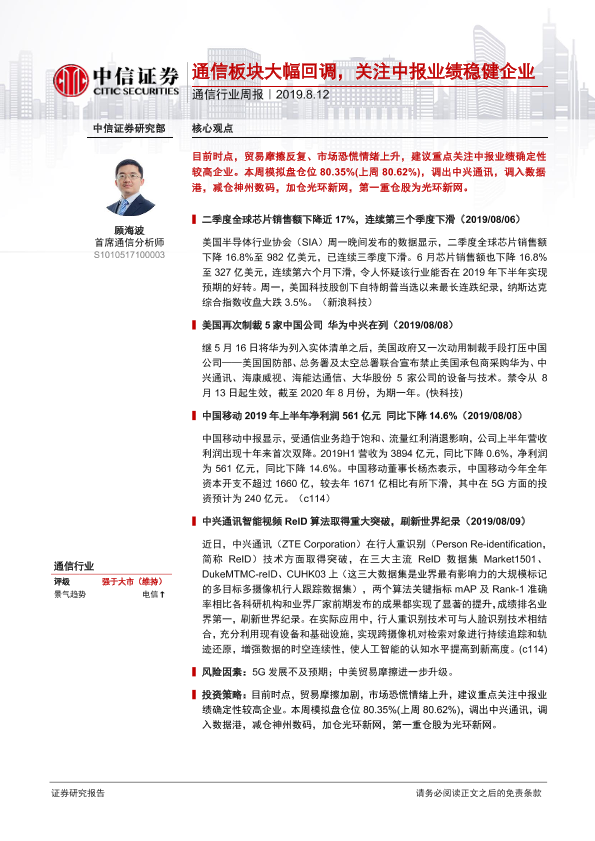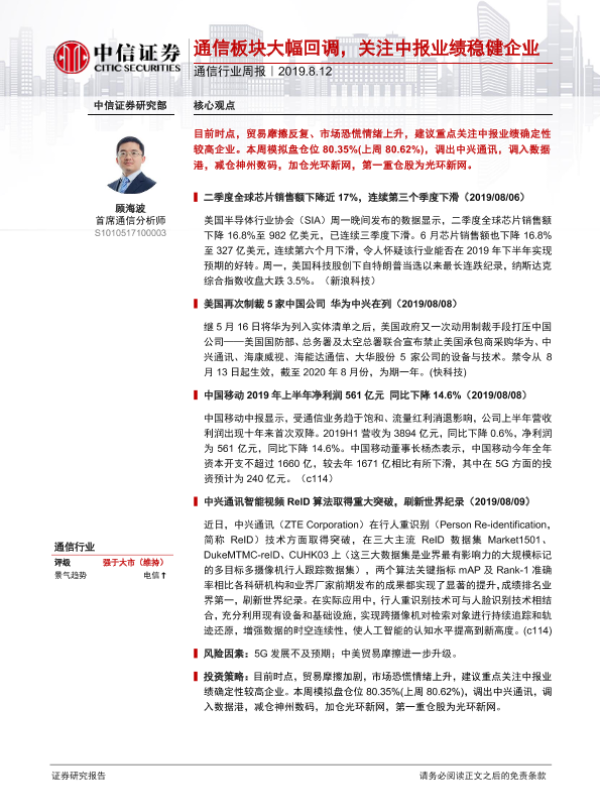 【中信证券】【20190812】通信行业周报:通信板块大幅回调,关注中报业绩稳健企业-8页