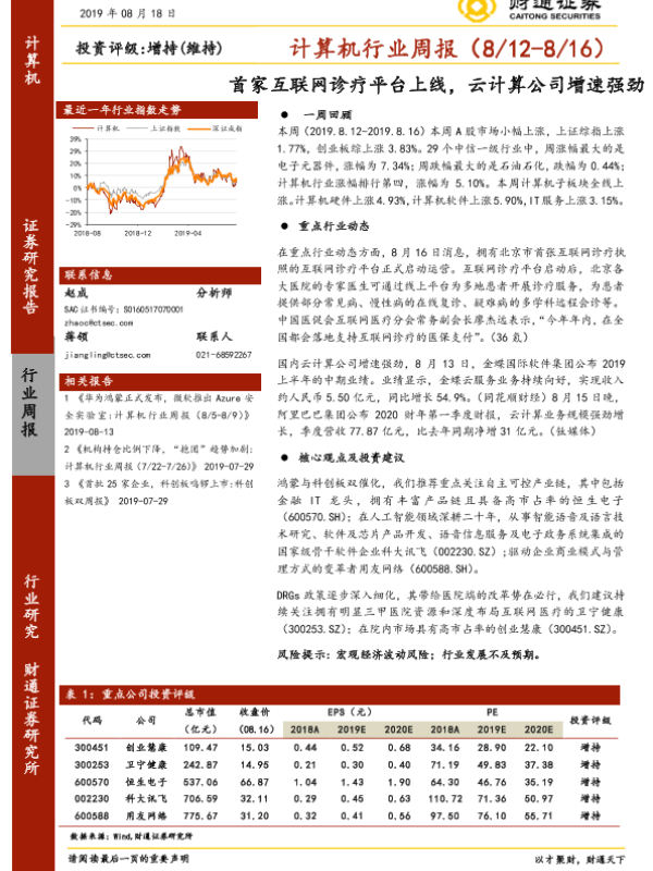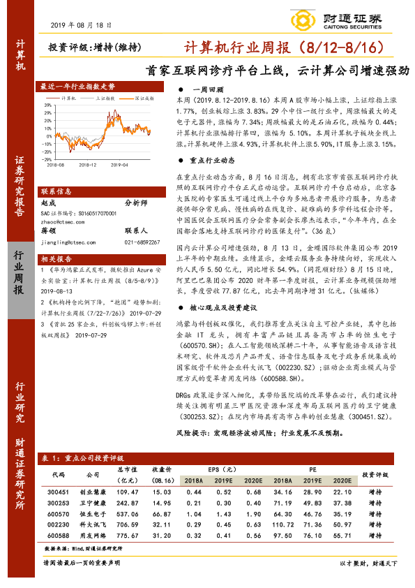 【财通证券】【20190818】计算机行业周报:首家互联网诊疗平台上线,云计算公司增速强劲-14页