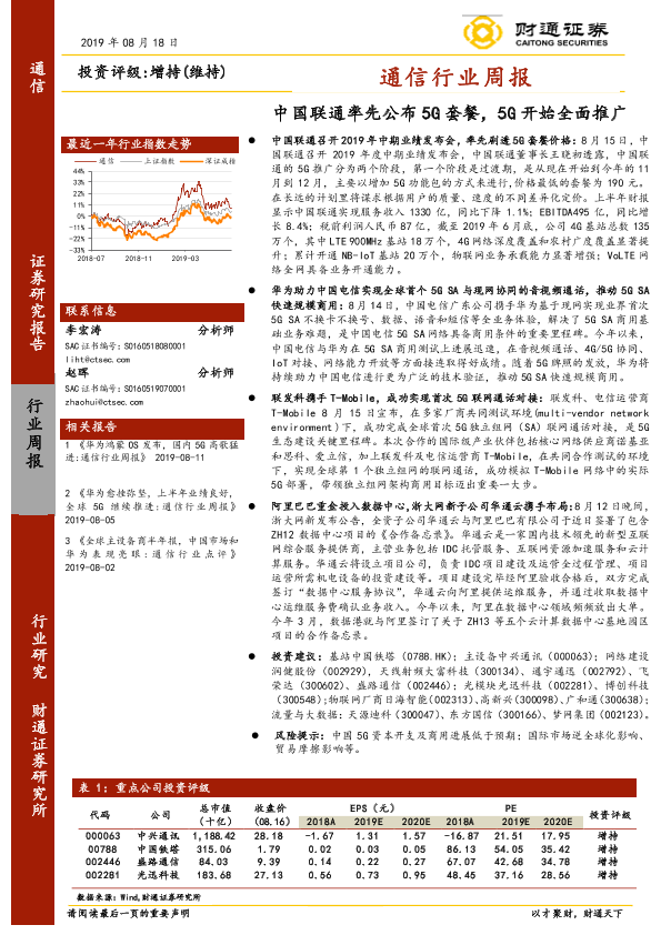 【财通证券】【20190818】通信行业周报:中国联通率先公布5G套餐,5G开始全面推广-16页