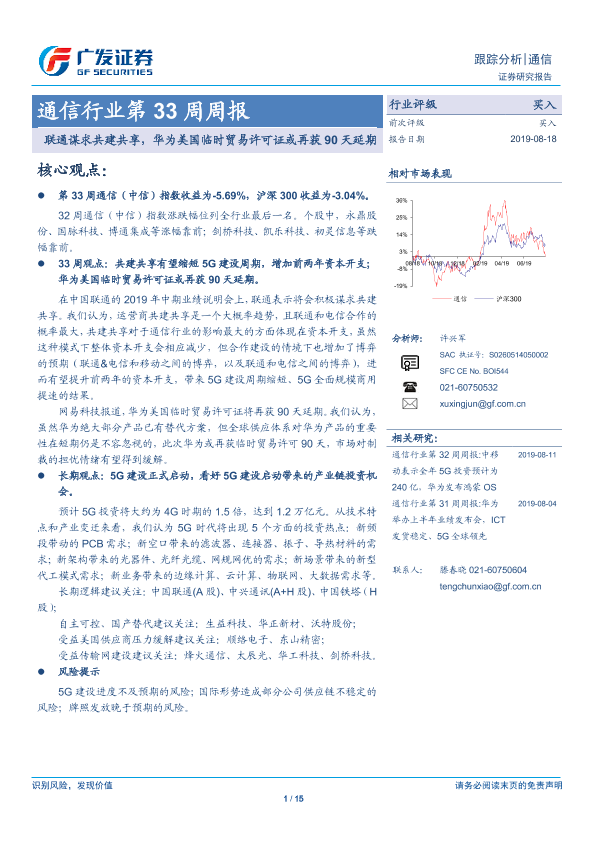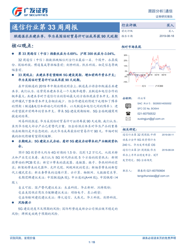 【广发证券】【20190818】通信行业第33周周报:联通谋求共建共享,华为美国临时贸易许可证或再获90天延期-15页