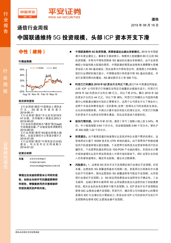 【平安证券】【20190818】通信行业周报:中国联通维持5G投资规模,头部ICP资本开支下滑-5页