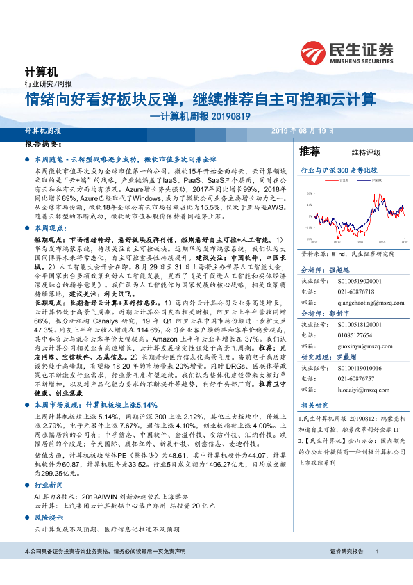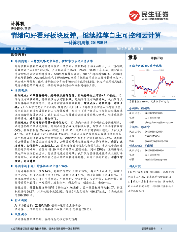 【民生证券】【20190819】20190819-民生证券-计算机周报:情绪向好看好板块反弹,继续推荐自主可控和云计算-11页