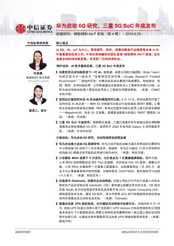 【中信证券】【20190820】20190820-中信证券-前瞻研究:物联网和AIoT周报(第4期):华为启动6G研究,三星5GSoC年底发布-5页