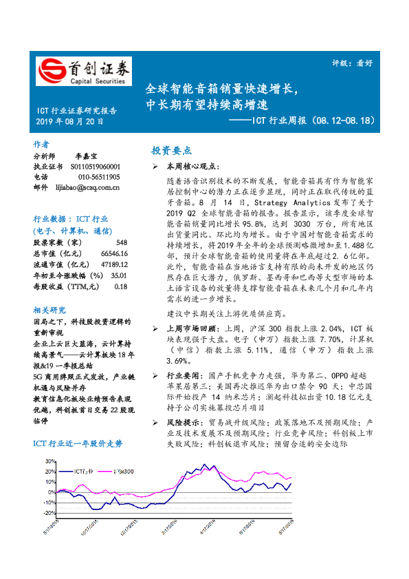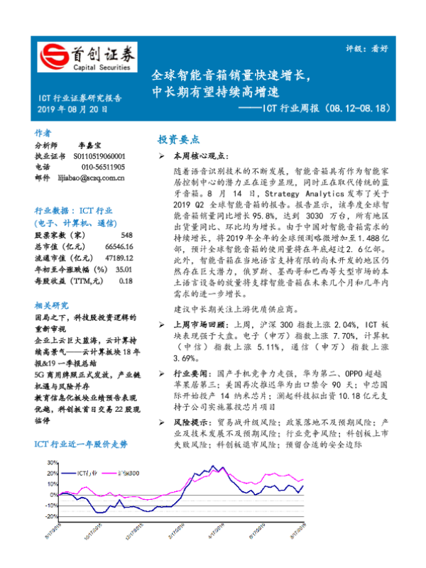 【首创证券】【20190820】ICT行业周报:全球智能音箱销量快速增长,中长期有望持续高增速-14页
