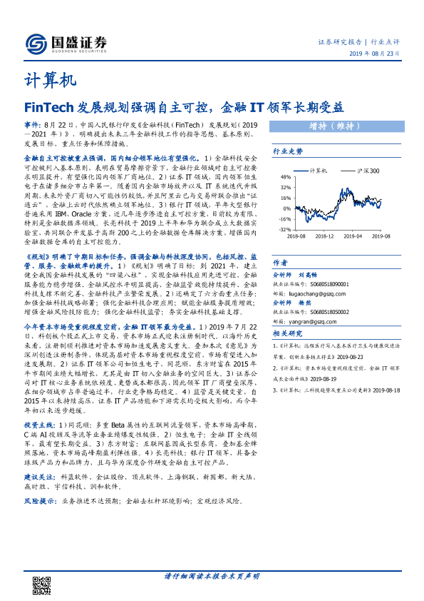 【国盛证券】【20190823】计算机:FinTech发展规划强调自主可控,金融IT领军长期受益-2页