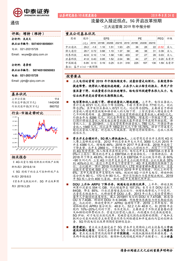 【中泰证券】【20190824】通信行业深度报告:三大运营商2019年中报分析-流量收入接近拐点,5G开启改革预期-15页