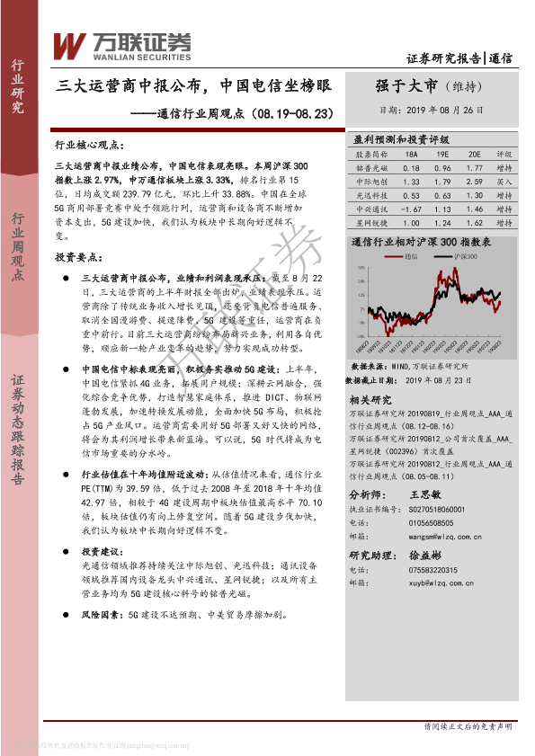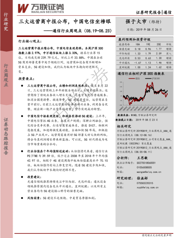 【万联证券】【20190826】20190826-万联证券-通信行业周观点:三大运营商中报公布,中国电信坐榜眼-10页
