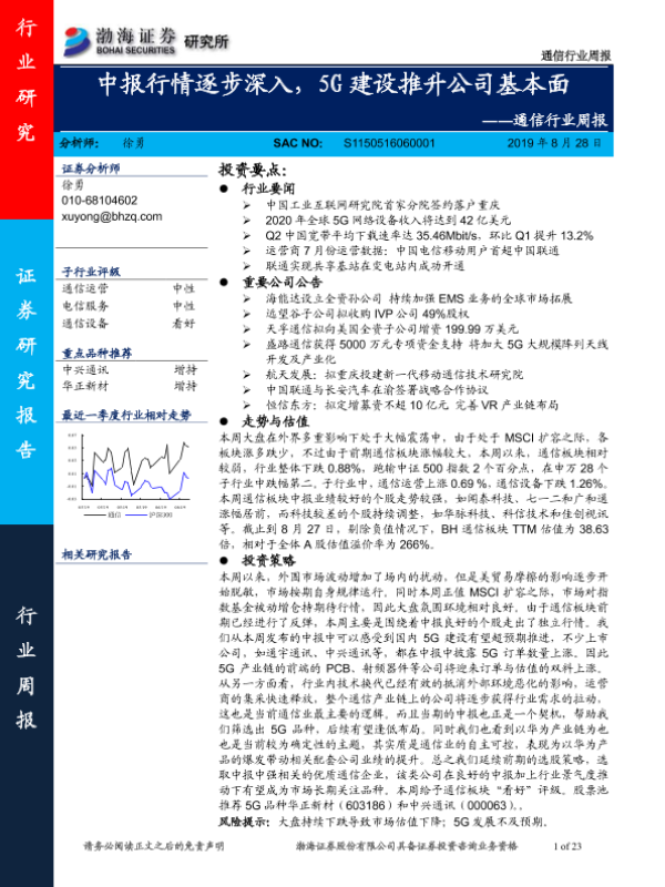 【渤海证券】【20190828】通信行业周报:中报行情逐步深入,5G建设推升公司基本面-23页