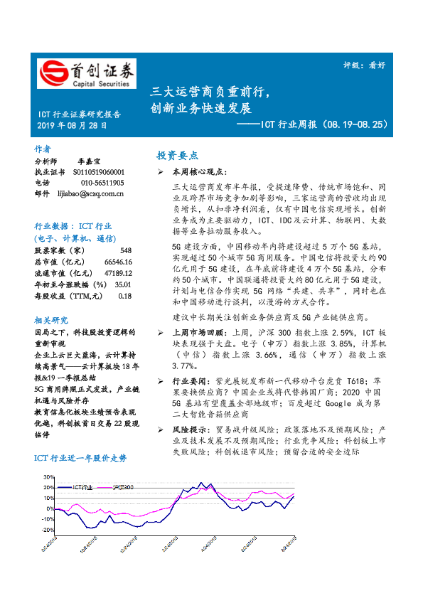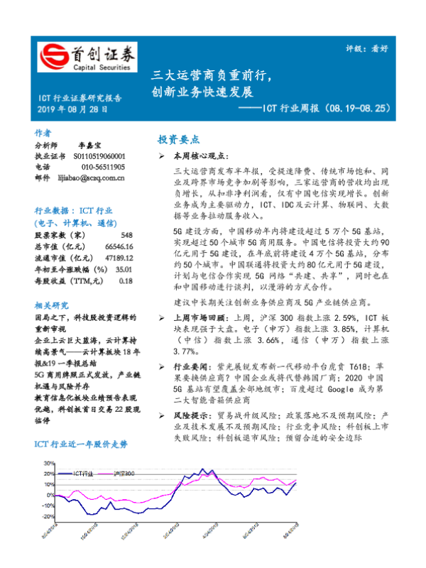 【首创证券】【20190828】ICT行业周报:三大运营商负重前行,创新业务快速发展-13页