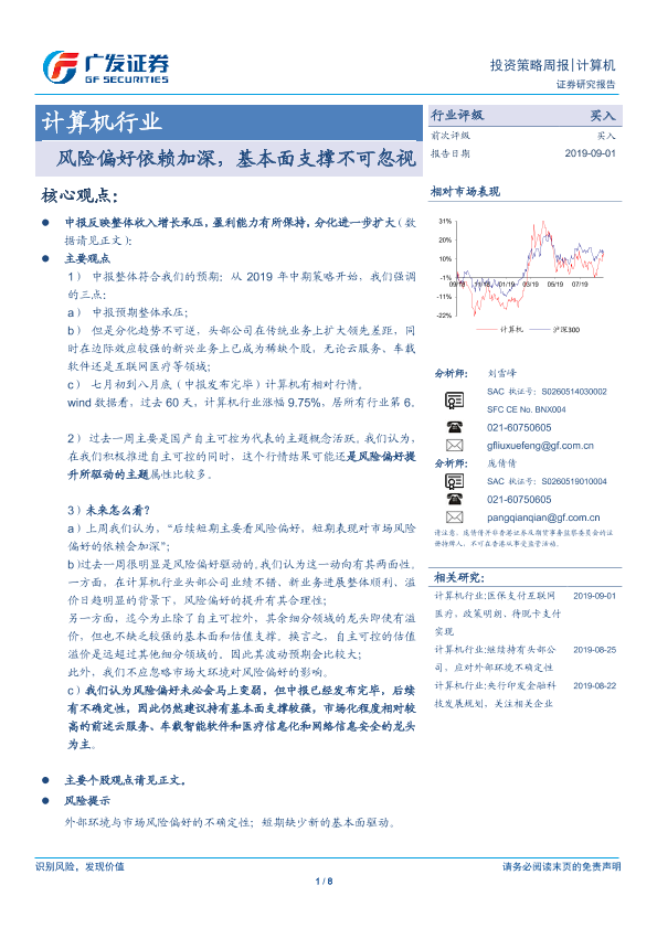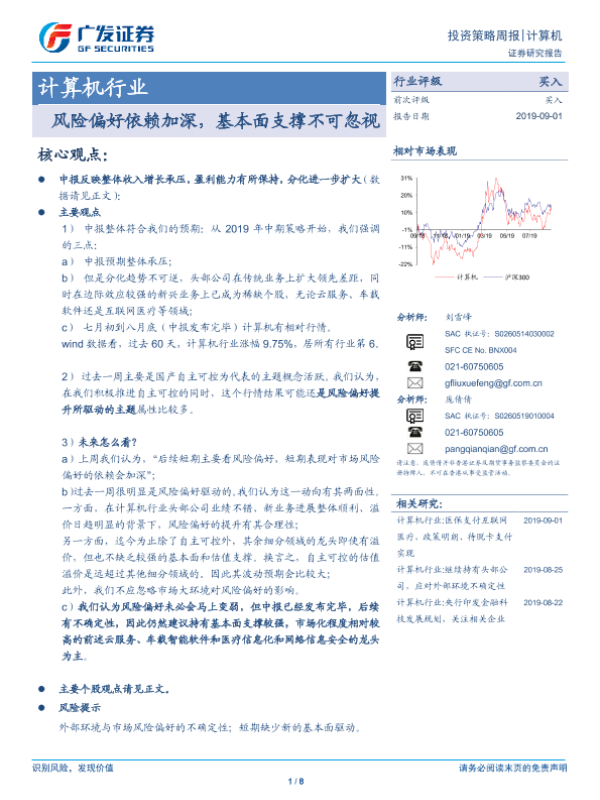 【广发证券】【20190901】20190901-广发证券-计算机行业投资策略周报:风险偏好依赖加深,基本面支撑不可忽视-8页