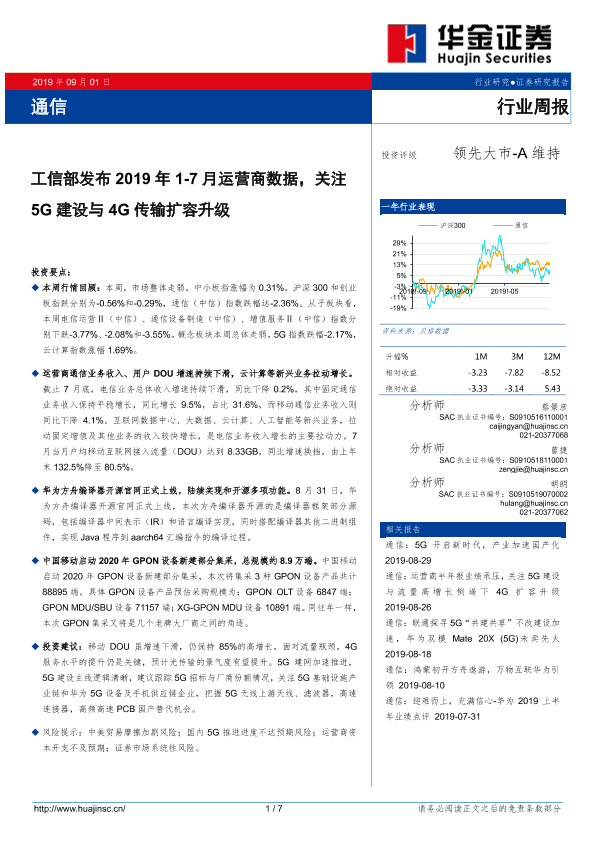 【华金证券】【20190901】20190901-华金证券-通信行业周报:工信部发布2019年1-7月运营商数据,关注5G建设与4G传输扩容升级-7页