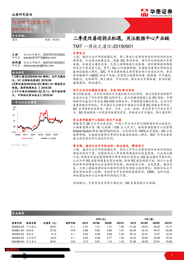 【华泰证券】【20190901】TMT一周谈之通信:二季度改善迎拐点机遇,关注数据中心产业链-19页