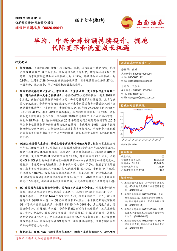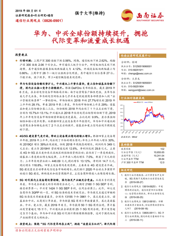 【西南证券】【20190901】通信行业周观点:华为、中兴全球份额持续提升,拥抱代际变革和流量成长机遇-36页