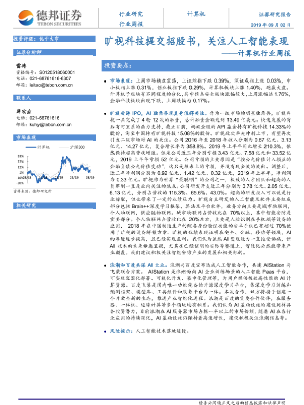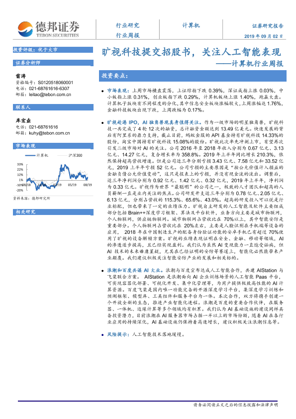 【德邦证券】【20190902】20190902-德邦证券-计算机行业周报:旷视科技提交招股书,关注人工智能表现-4页