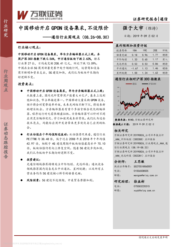 【万联证券】【20190902】通信行业周观点:中国移动开启GPON设备集采,不设限价-13页